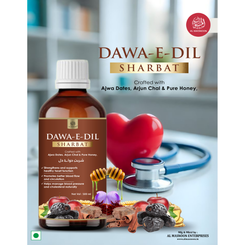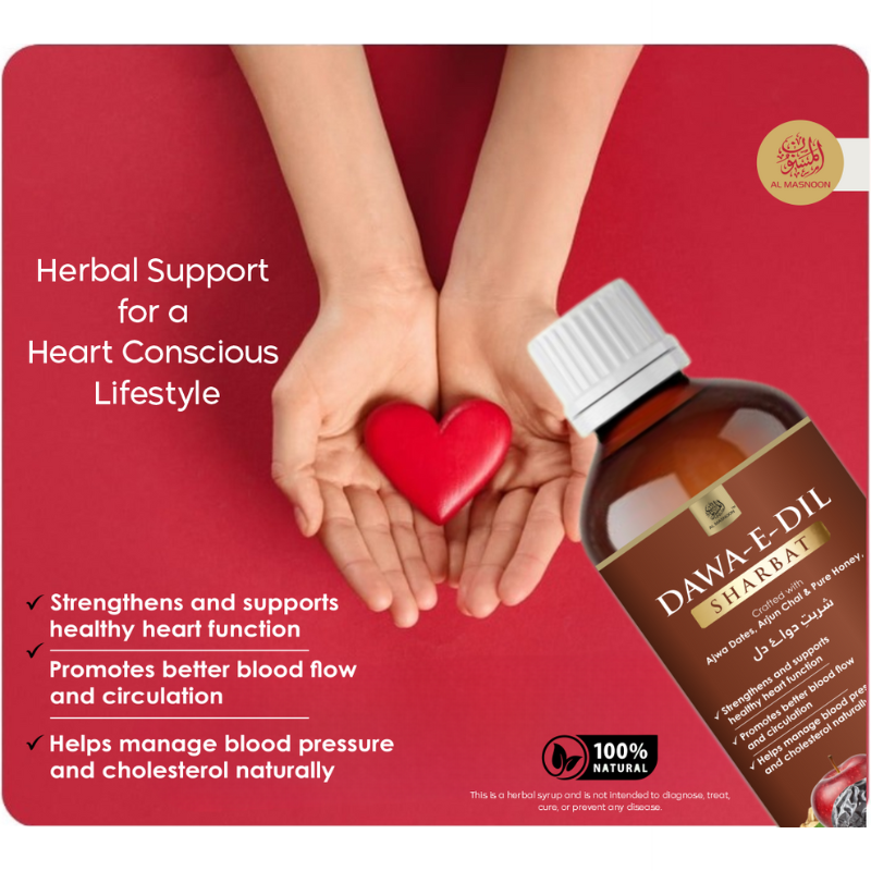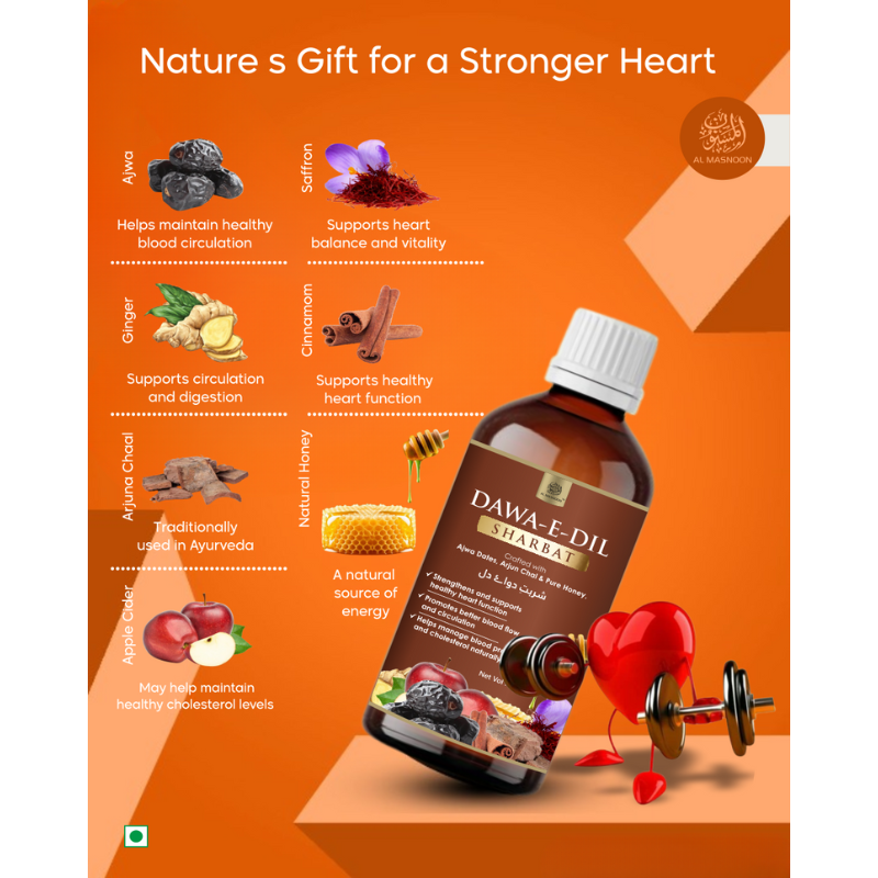 Dawa-e-Dil Sharbat is a herbal wellness tonic crafted with Ajwa dates, Arjun chhal, saffron, ginger, cinnamon, apple cider, and pure honey. Formulated to support a heart-conscious lifestyle, it helps promote healthy blood circulation, supports balanced cholesterol levels, and contributes to overall heart vitality. Made with natural ingredients and inspired by traditional Ayurvedic wisdom, itās a refreshing daily addition for those seeking natural cardiovascular support.