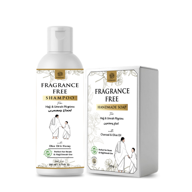 This thoughtfully curated combo includes a Fragrance-Free Shampoo and a Fragrance-Free Handmade Soap, specially designed for Hajj and Umrah pilgrims. Both products are compliant with Ihram requirements, making them safe and suitable for use during sacred rituals.