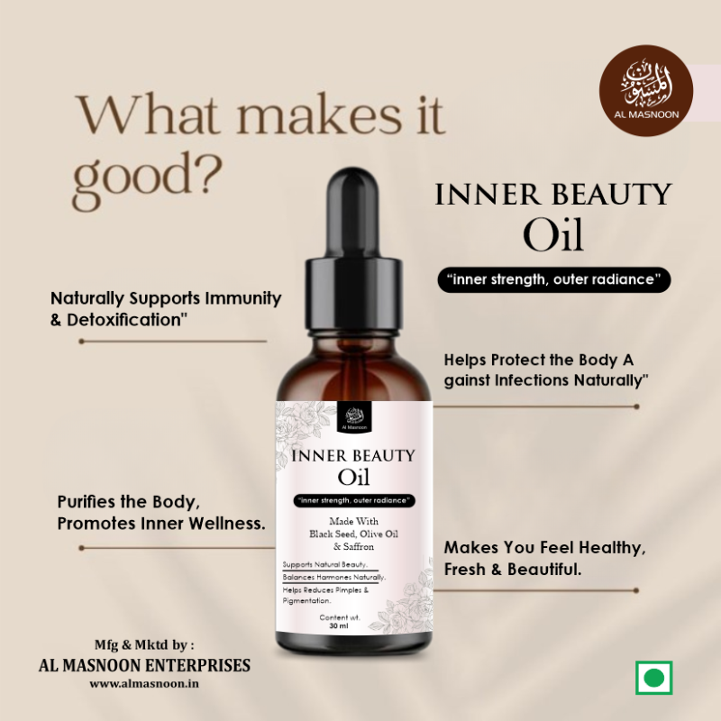 AL MASNOON Inner Beauty Oil For Women Natural Herbal Blend With Black Seed, Olive, Saffron & More | For Inner Glow & Wellness | 30ml Pack of 1 | Edible Intake