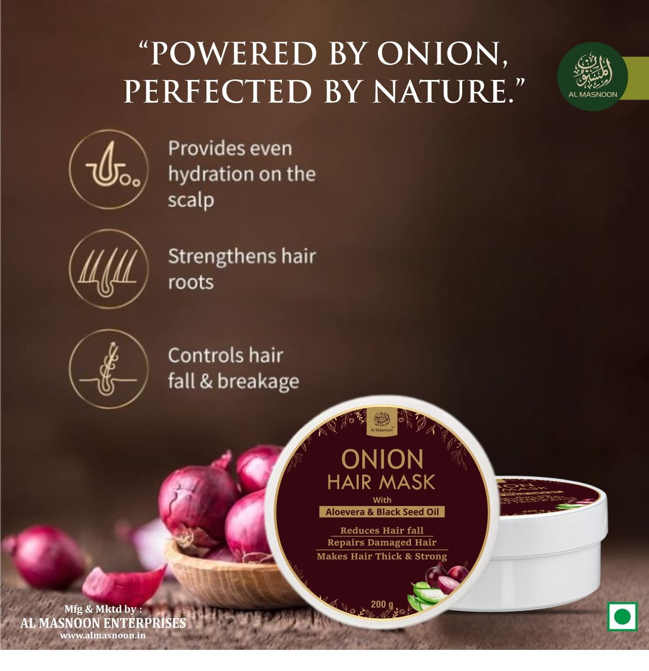 AL MASNOON Onion Hair Mask with Aloe Vera & Black Seed Oil – Reduces Hair Fall, Repairs Damaged Hair, SLS & Paraben Free (200 g, Pack of 1)
