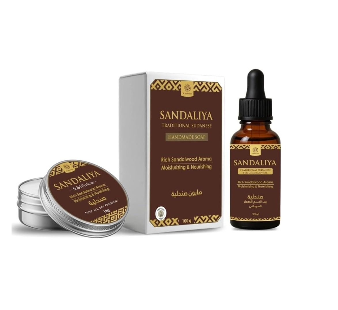 AL MASNOON Sandaliya Body Care Kit Combo | Traditional Sudanese Sandalwood Beauty Set with Sandaliya Body Oil (30ml), Sandaliya Solid Perfume (10g), & Sandaliya Soap (100g) | Luxurious Herbal Skin & Body Care | Rich Sandalwood Aroma | Pack of 3