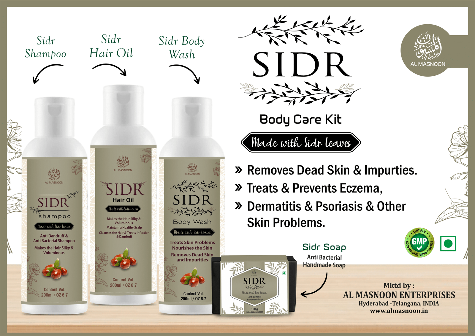 AL MASNOON Sidr Body Care kit / Sidr Shampoo 200ml / Sidr Body Wash 200ml / Sidr hair oil 200ml/ Sidr Soap /Made with Sidr Leaves