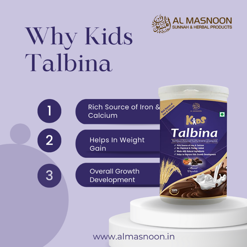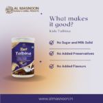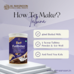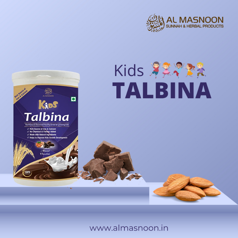 Al Masnoon “kids talbina” is made bye dry roasting process that seals in all the nutrient, kids talbina is rich in energy, calcium,protein,fibrer,iron,. kids talbina is ideal for the all-round nourishment of the human body. it is also especially beneficial for growing children . children can enjoye kids talbina as a delicious drink of use it like milk throughout the day