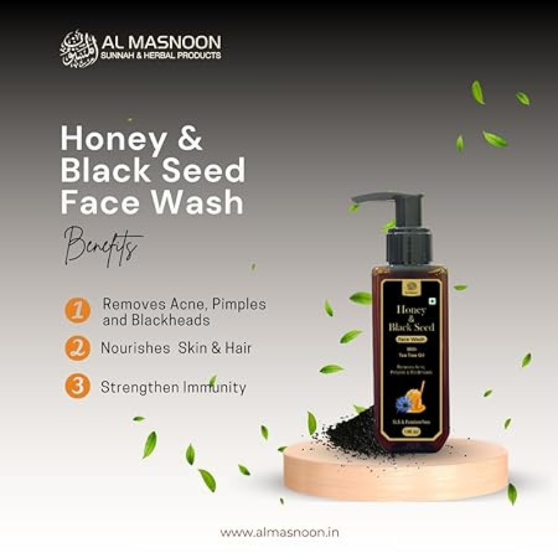 - Immerse yourself in the rejuvenating purity of Al Masnoon Honey Black Seed Face Wash with Tea Tree Oil, meticulously formulated with the enriching essence of pure honey, potent black seed oil and extracts, and the soothing power of tea tree oil.